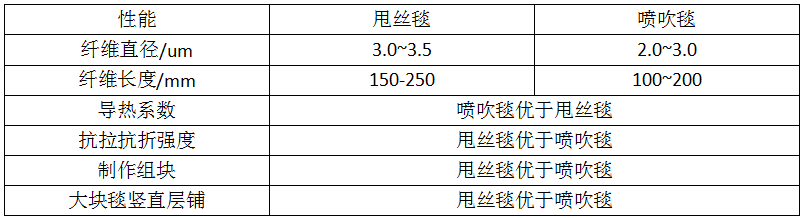 表1 陶瓷纖維毯甩絲毯和噴吹毯性能與應用對比