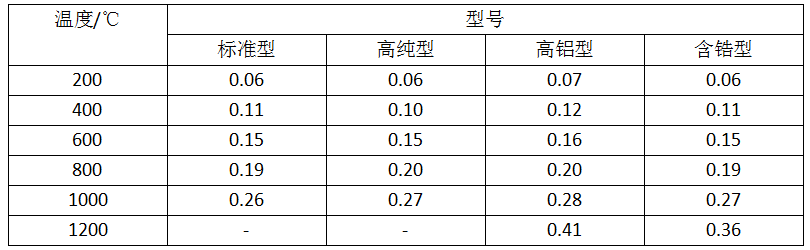 根據其工藝的不同,陶瓷纖維毯可分為甩絲毯和噴吹毯兩大類,兩種類型的陶瓷纖維毯性能見表1。不同溫度下陶瓷纖維毯的導熱系數見表2。