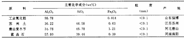 選用工業氧化鋁和蘇州土為主要原料,少量加入唐山紫木節和藍晶石。原料的化學組成見表1。
