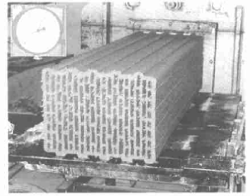 為了利用磚瓦工業(yè)中常見的設(shè)備和擠出成型技術(shù)生產(chǎn)微孔多孔磚必須將摻有成孔劑的原料處理成可以擠出的漿料。首先用快速攪拌器將原料制成固體成分占的漿料在漿料的攪拌過程中摻入穩(wěn)定劑和成孔劑穩(wěn)定劑具有液化作用可以降低漿料的含水量并改善漿料的流動(dòng)性能穩(wěn)定劑的混入可將漿料變稠變硬。漿料和成孔劑也可同時(shí)連續(xù)地注入雙軸攪拌機(jī)中進(jìn)行強(qiáng)力攪拌,直到獲得所需的稠度。干物料的摻入會(huì)影響擠出磚坯的均勻性,因此,干物料一定要摻入到雙軸攪拌機(jī)中。為了獲得較低體積密度(0.4〜0. 5kg/ dm3)的磚制品,需摻入粉狀的稻草、鋸末和極細(xì)的聚苯乙烯;粉狀石灰或粘土的摻入可以生產(chǎn)較高密度(0.7〜0. 8kg/dm3)的磚制品。成型時(shí)采用改進(jìn)過的不需抽真空的磚機(jī),成型壓力不需太高。盡管微孔孔隙率較高,仍可生產(chǎn)出孔洞率達(dá)50 %的多孔磚。生產(chǎn)如此高孔隙率、高孔洞率、高精致結(jié)構(gòu)的多孔磚是有實(shí)際價(jià)值的,圖1為正在擠出的高孔洞率微孔多孔磚。