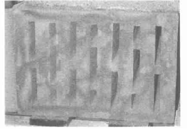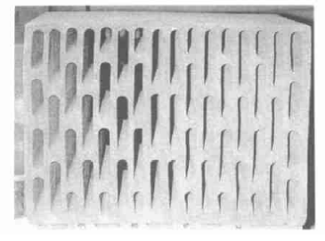 圖5為經(jīng)另一機(jī)口擠出的16排孔的短壁多孔磚,其磚坯的真實(shí)密度為0.82 kg/ dm3,孔洞率為50%時(shí)的體積密度為0.41 kg/ dm3,其導(dǎo)熱系數(shù)為人=0.094W/(m.K),