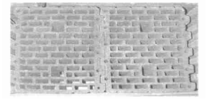 抗壓強(qiáng)度為4. 4N/mm2。該多孔磚的缺點(diǎn)是;其在工業(yè)化的生產(chǎn)中不可避免地會(huì)出現(xiàn)扭曲變形,因此,擠出型的微孔多孔磚必須具有足夠厚度的外壁和齒狀的凸起,便于磚相互間組裝拼接(見圖6),從而消除砂漿連接引起的熱力學(xué)問題。在隨后的試驗(yàn)中還擠出成型了19排孔和13排孔的10DF微孔多孔磚見圖6圖7 ,這些磚外壁還有齒狀的凸起。